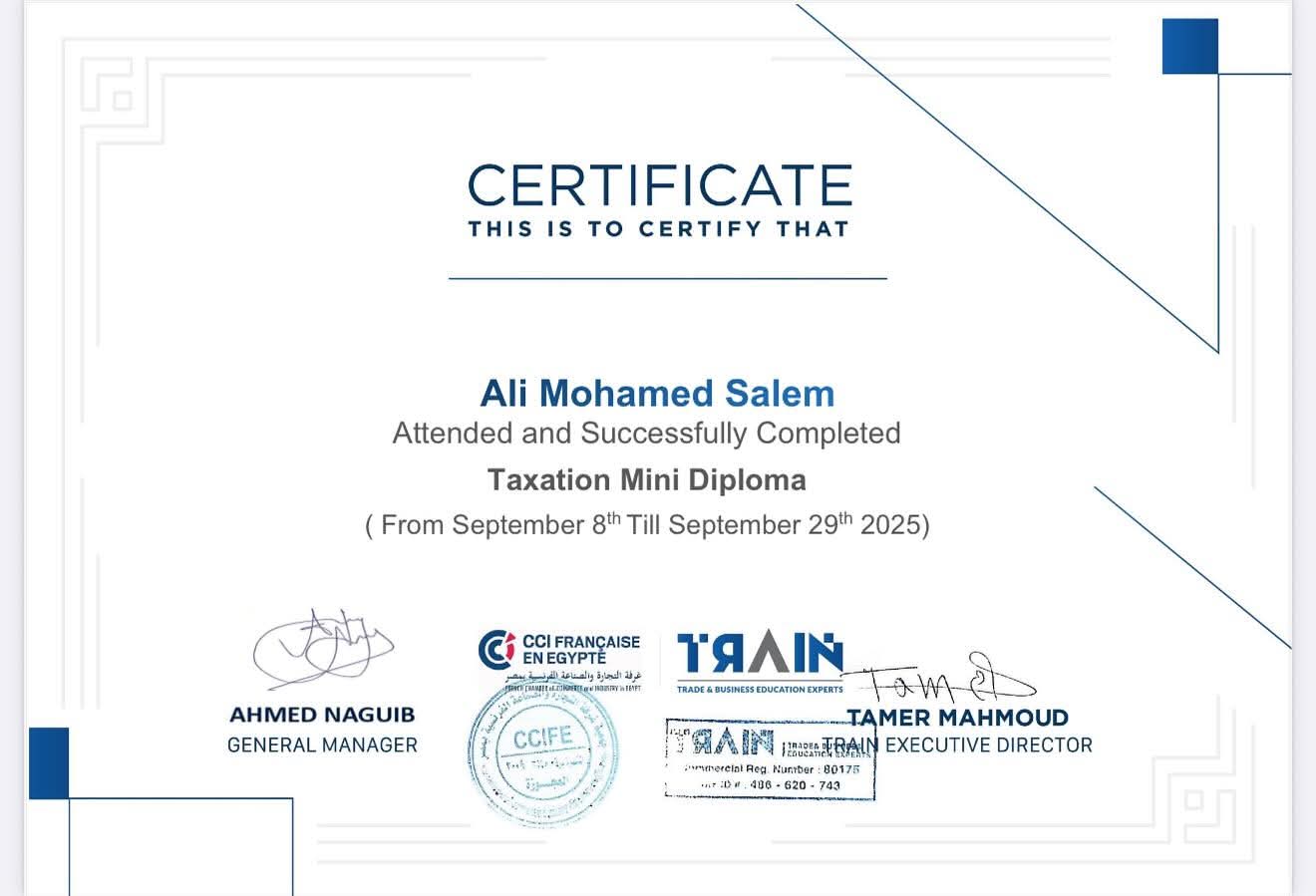 حصل رائد الأعمال علي سالم، على دبلومة في الضرائب (Taxation Mini Diploma) من غرفة التجارة والصناعة الفرنسية بمصر، وذلك في إطار سعيه الدائم لتعزيز خبراته ومعارفه في مجال الإدارة المالية والضرائب، وتطوير مهاراته لدعم الأعمال والمشروعات بشكل أكثر احترافية.