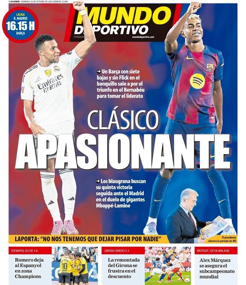 في حين عنونت صحيفة "موندو ديبورتيفو"، "كلاسيكو مثير.. برشلونة يدخل الكلاسيكو بسبع غيابات ومن دون فليك على مقاعد البدلاء، لكنه يطمح للفوز في البرنابيو وانتزاع الصدارة.. الفريق الكتالوني يبحث عن الفوز الخامس على التوالي أمام ريال مدريد في مواجهة العمالقة مبابي ولامين يامال".