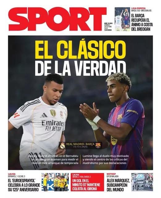 وعنونت صحيفة "سبورت"، "الكلاسيكو الحقيقي.. ريال مدريد وبرشلونة يخوضان امتحانًا كبيرًا في البرنابيو لقياس مستواهما في هذا بداية الموسم.. لامين يامال يدخل اللقاء بحماس كبير رغم كونه محور انتقادات جماهير ريال مدريد بعد تصريحاته الأخيرة".