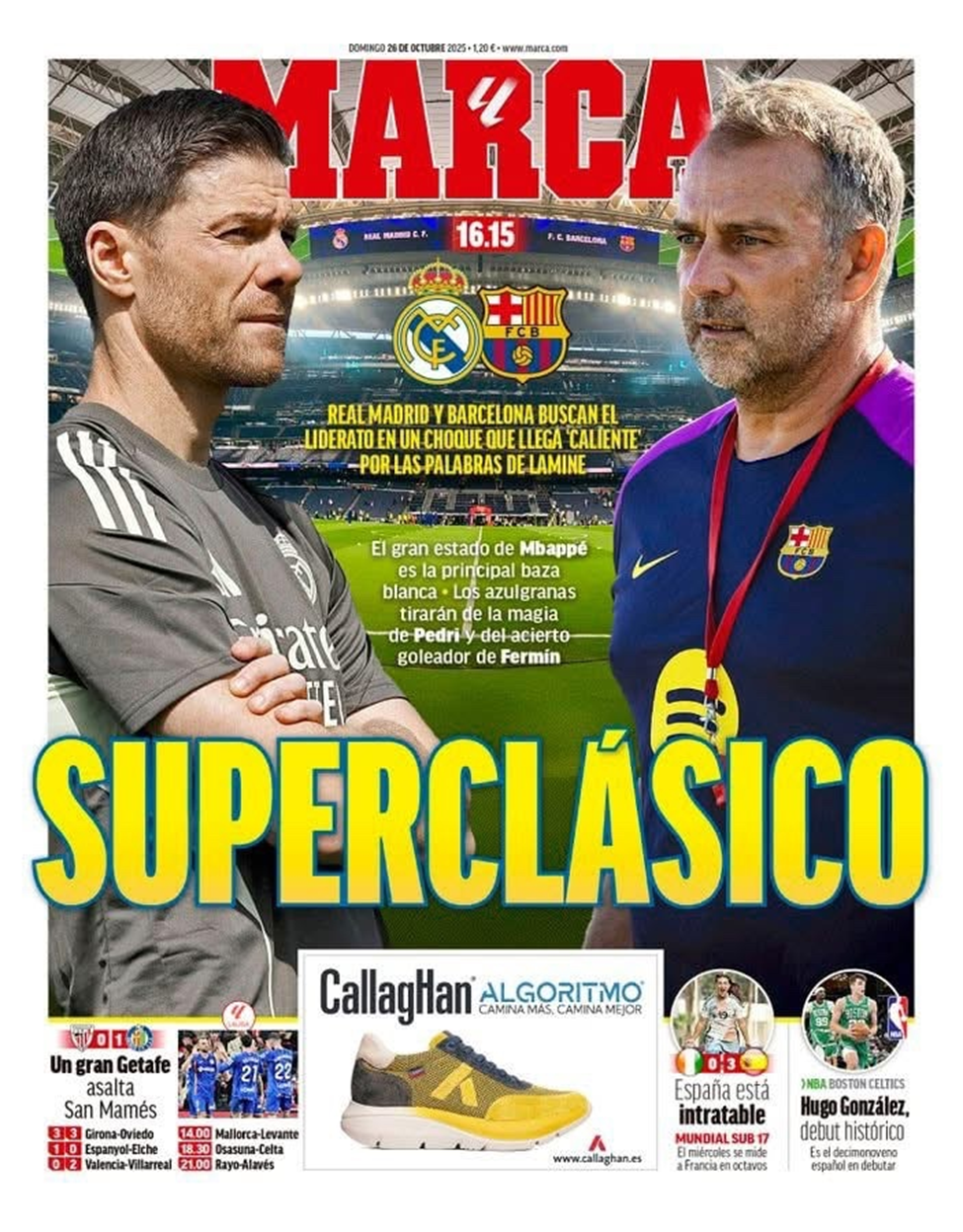 صحيفة "ماركا" أبرزت أن المواجهة ستكون "الكلاسيكو الكبير" مع تسليط الضوء على تألق مبابي كأبرز سلاح للريال، وسحر بيدري ودقة فيرمين التهديفية لدى برشلونة، بالإضافة إلى الجدل حول تصريحات لامين يامال التي أثارت حماس الجماهير.