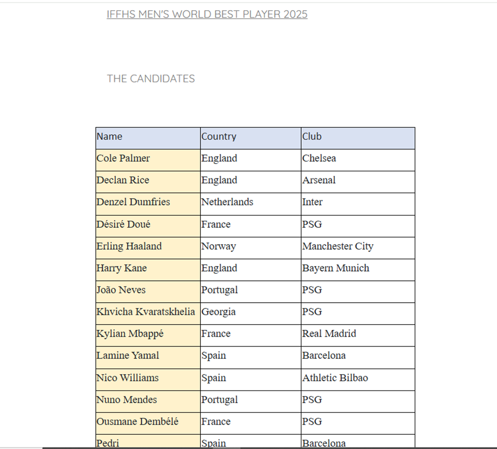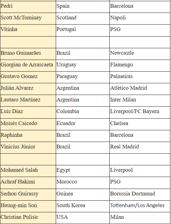 كما تضم القائمة نجومًا آخرين على مستوى عالمي، من بينهم أشرف حكيمي لاعب منتخب المغرب ونادي باريس سان جيرمان، ولويس دياز الذي انتقل مؤخراً من ليفربول الإنجليزي إلى بايرن ميونخ الألماني، وفينسيوس جونيور لاعب منتخب البرازيل وريال مدريد الإسباني.