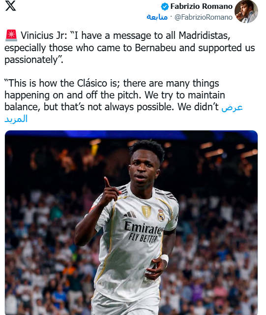 وقال فينيسيوس بعد اللقاء: "أوجّه رسالة لكل المدريديستا، خاصة الذين حضروا إلى البرنابيو وشجعونا بشغف كبير. هذا هو طابع الكلاسيكو، تحدث فيه الكثير من الأمور داخل الملعب وخارجه، نحاول دائماً الحفاظ على التوازن، لكن ذلك لا يكون سهلاً في مثل هذه المباريات".