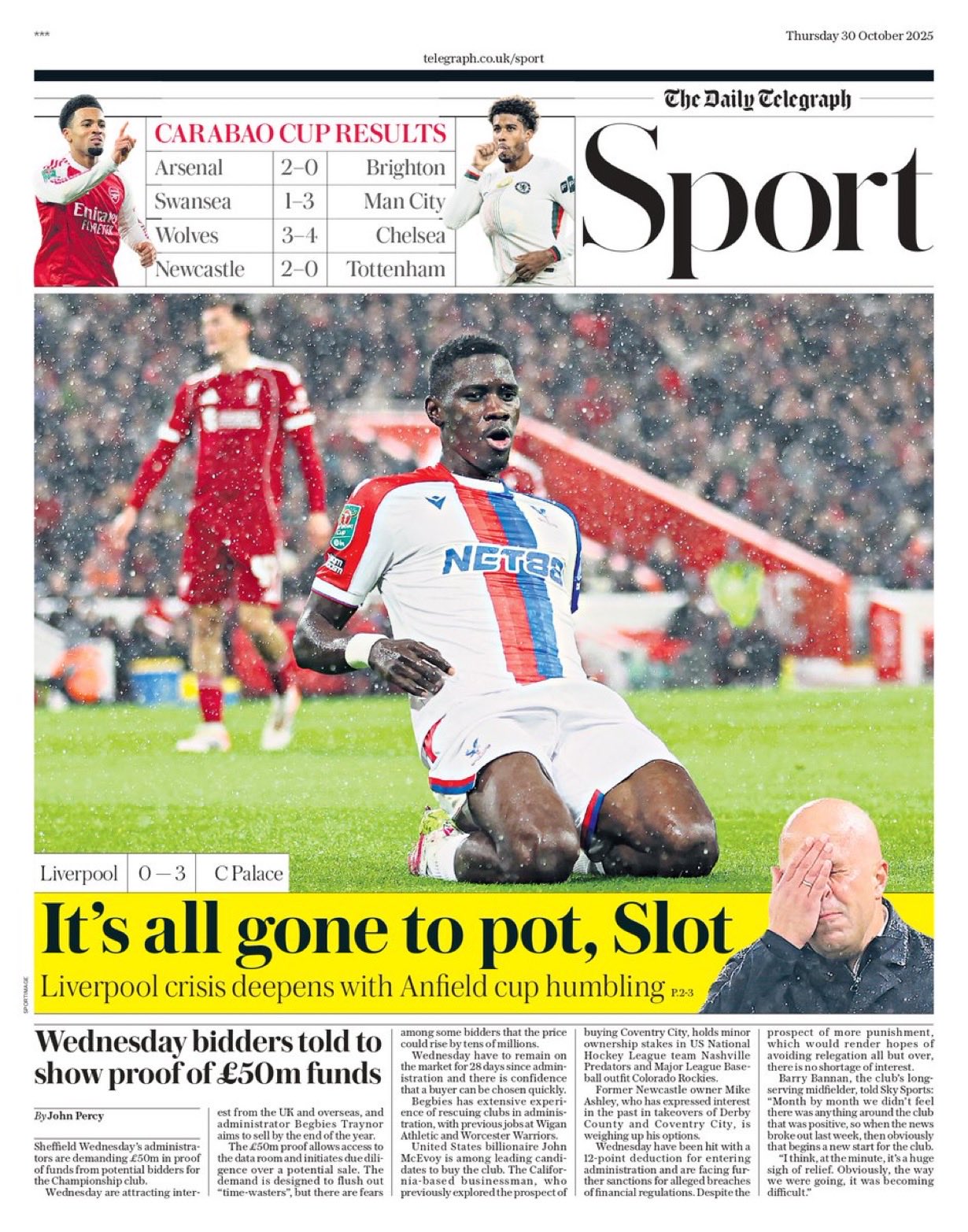 من جانبها، عنونت صحيفة "التليجراف": "انهار كل شيء يا سلوت"، وأشارت إلى أن الهزيمة المذلة أمام كريستال بالاس على ملعبه وبين جماهيره تؤكد تفاقم الأزمة داخل الفريق.