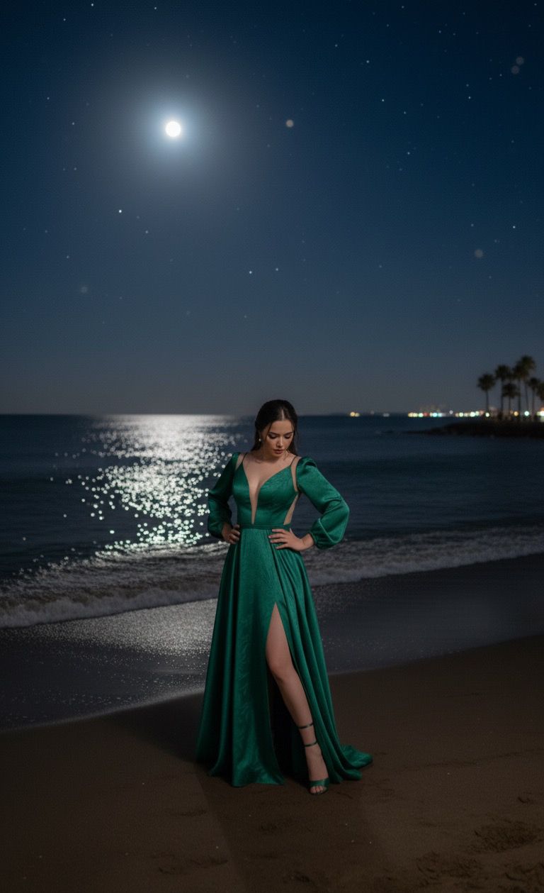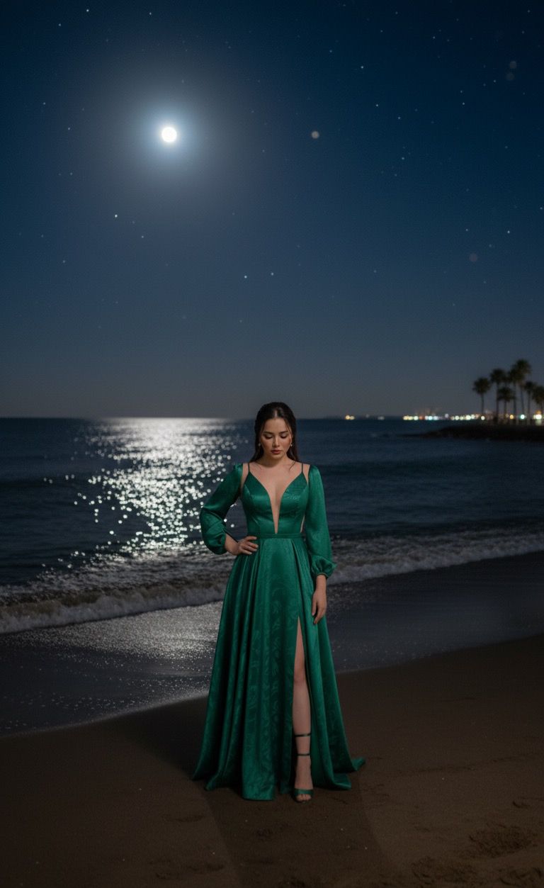 فاشون نادين المنسي تتألق بجلسة تصوير ليلية ساحرة بفستان أخضر جريء على شواطئ الغردقة