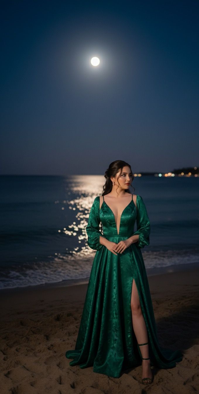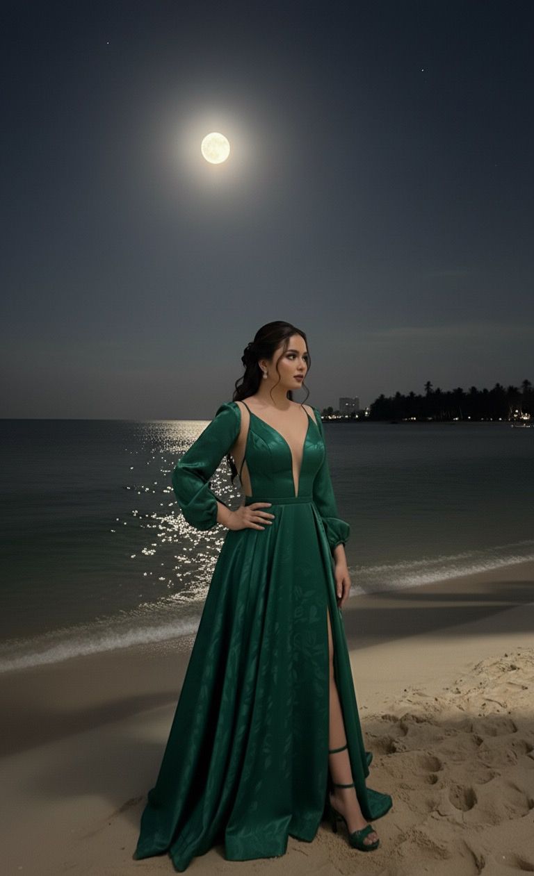 اختارت نادين ، اللون الأخضر لما يحمله من دلالات الحياة والطاقة والتجدد، فانعكست درجاته الزاهية على الأمواج المتلألئة بضوء القمر لتخلق مشهدًا فنيًا يخطف الأنفاس.